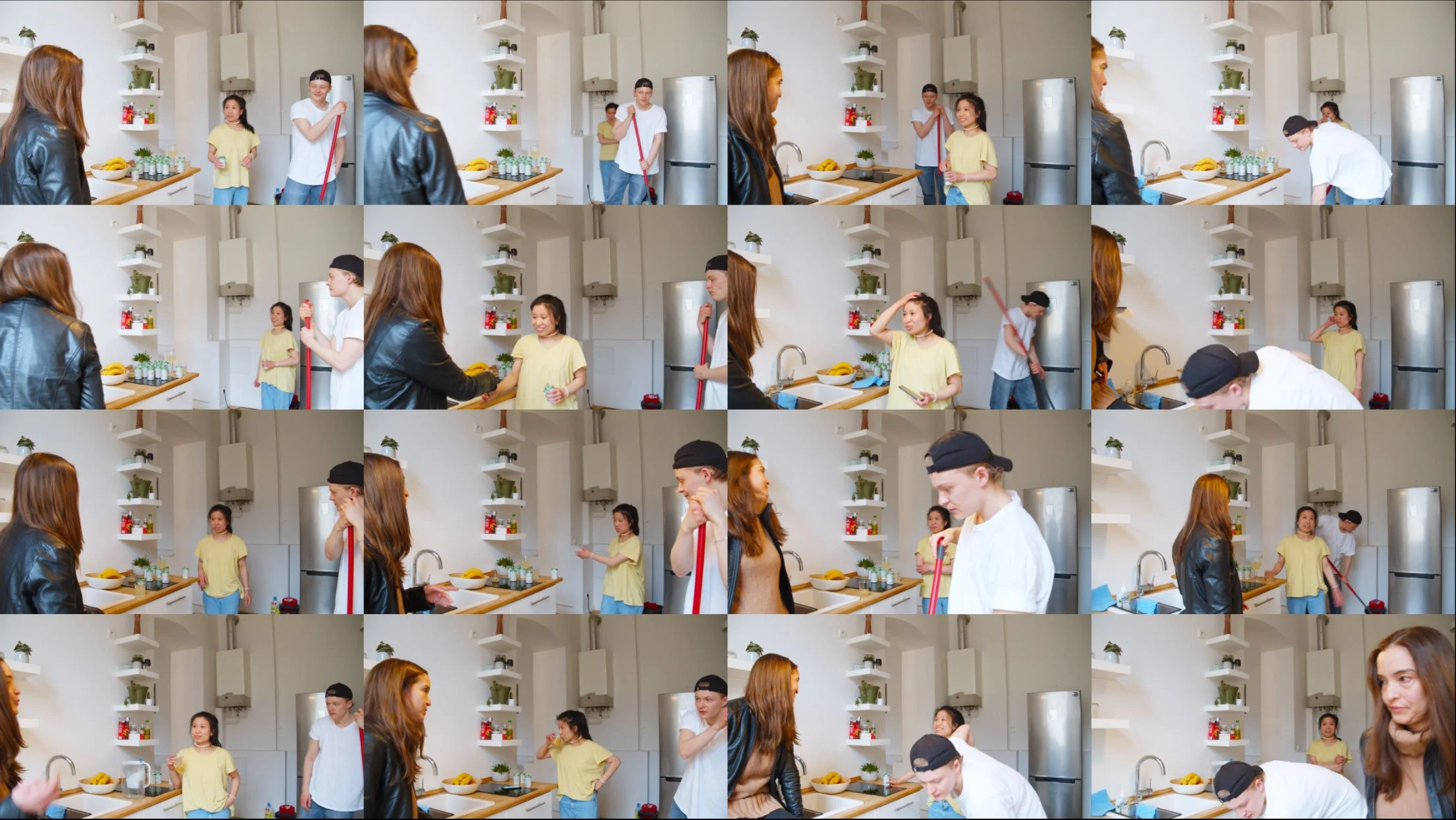 This video takes place in the kitchen in a design office, where the boss of the company, an intern and the cleaner interact during lunchtime break. As a prop, the intern is given 24 ginger shots in the fridge, which suggests the scene being repeated 24 times.